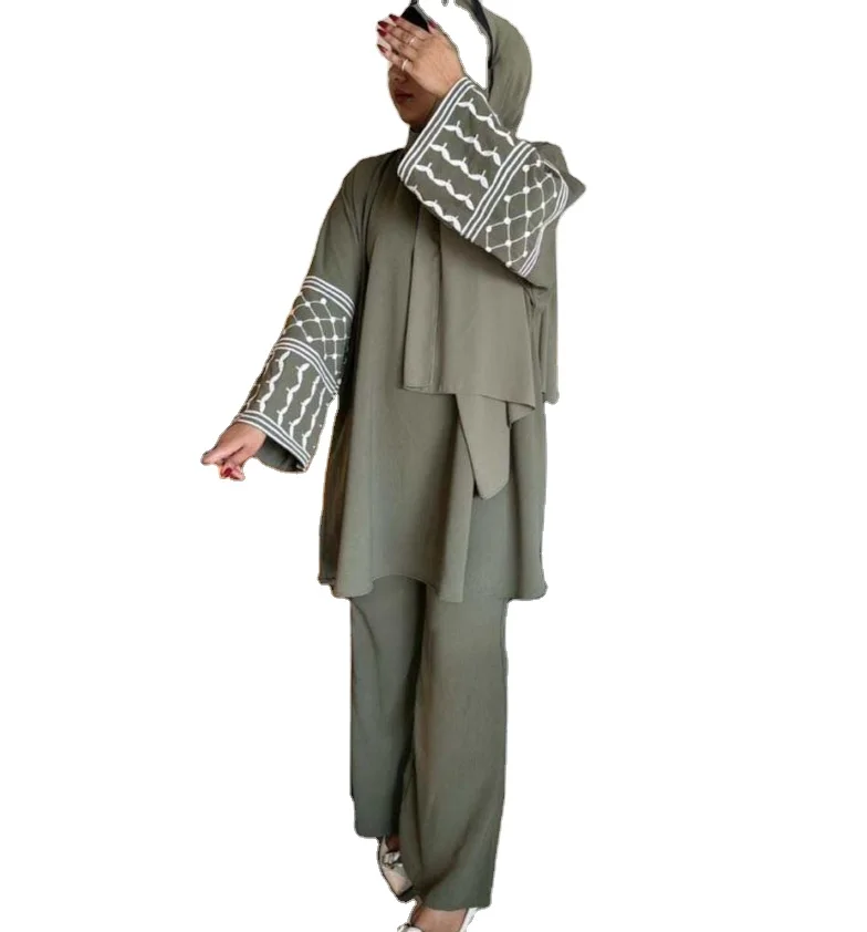 Traditional Muslim Women's Two-Piece Suit Embroidered Tops and Loose Fit Pants Chic Islamic Clothing